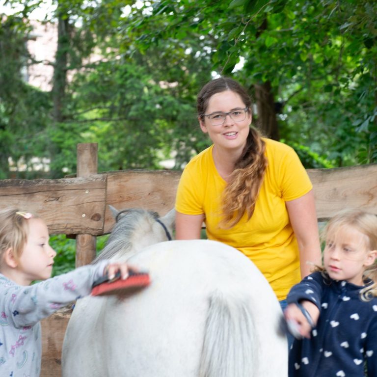 Wir arbeiten in unseren Gruppen mit maximal 6-8 Kindern, 2-3 Ponys, mir als Reitpädagogin und einer Hilfskraft.